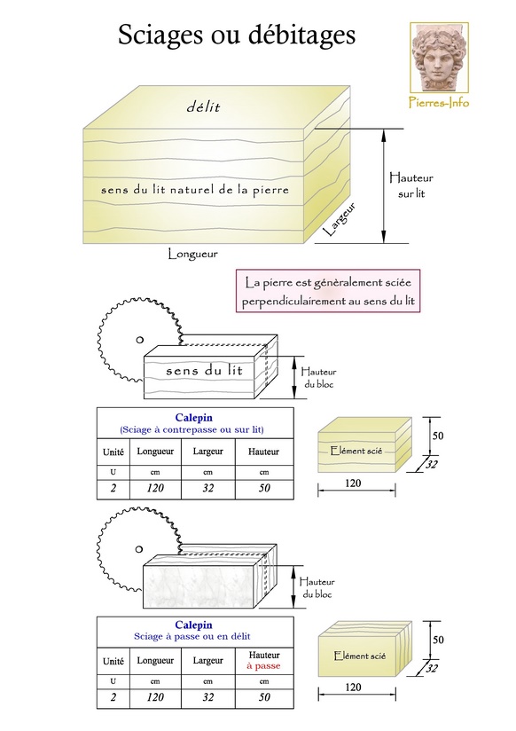 Dans un grand nombre de pierre, les sens du lit de carrière n'est pas visible. Mais, sauf spécification exceptionnelle, la cote de hauteur indiquée par le carrier à l'extraction est toujours dans le sens du lit (voir dessin).
