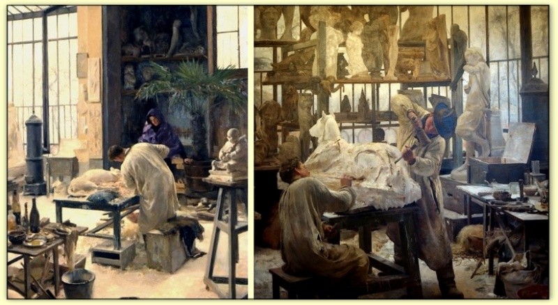Atelier du sculpteur Simoes de Almeida par Jose Malhoa (1883) José Simoes de Almeida (1844/1926) est un sculpteur portugais de pur style académique. Professeur à l'École des beaux-arts de Lisbonne, il a influencé plusieurs générations d'artistes. |  |