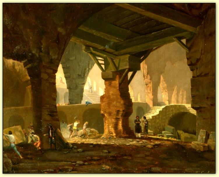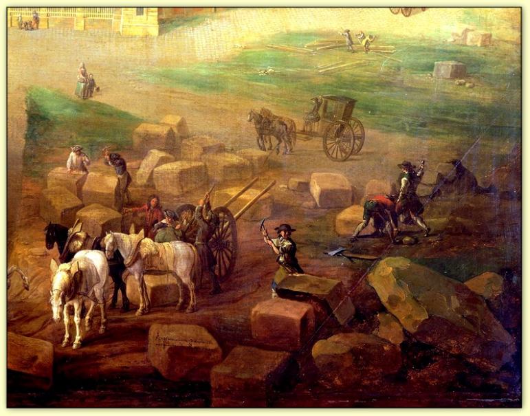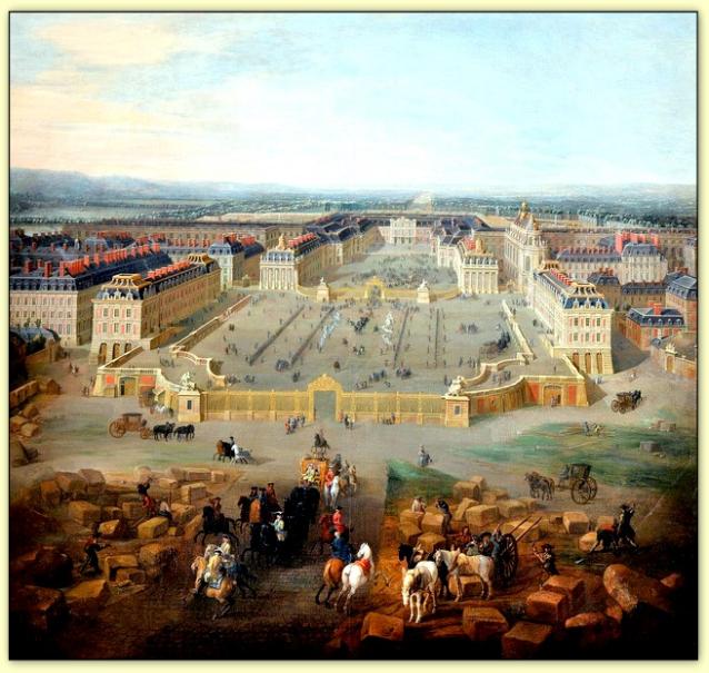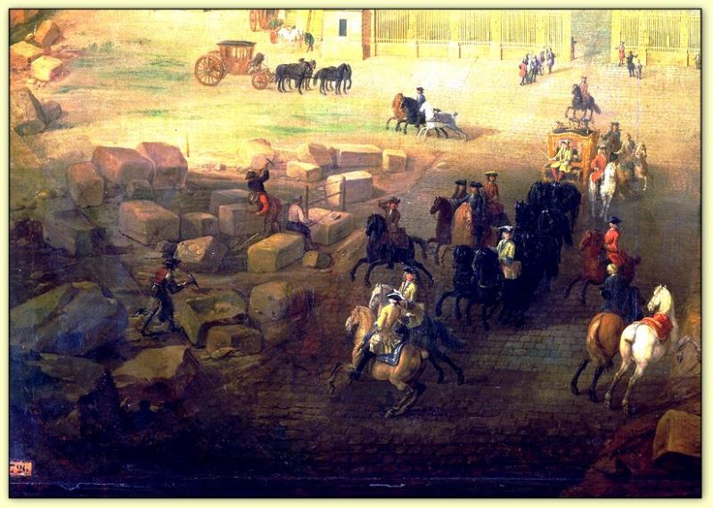 Versailles après Louis XIV par Pierre-Denis, dit MARTIN le Jeune MARTIN(1722) Au premier plan, le peintre décrit une place d'armes désordonnée où la voiture du prince de Conti, des chariots et des chevaux tentent de se frayer un chemin. Des tailleurs de pierre sont à l'œuvre, car la ville, qui doit accueillir une population en constante augmentation, est un chantier permanent.