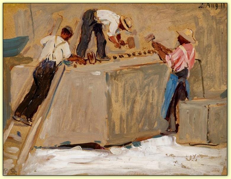 Chargement d'un bloc sur un plan incliné (Verladen des Blocks auf schiefer Ebene) par Robert Hermann Sterl