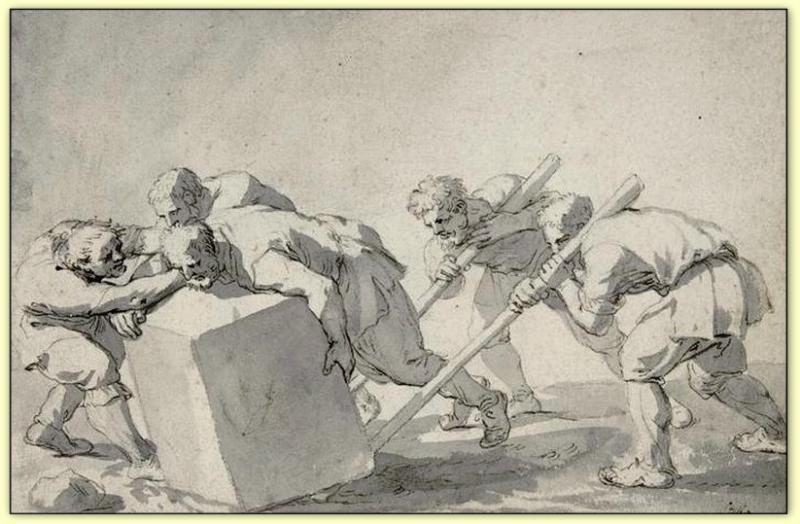5 hommes levant un bloc de pierre Stella Jacques (17e siècle)