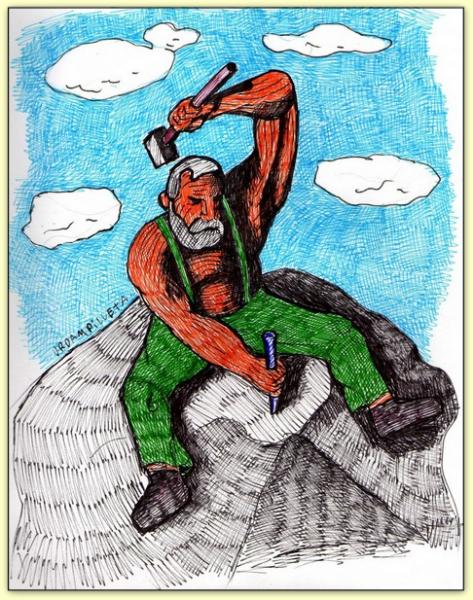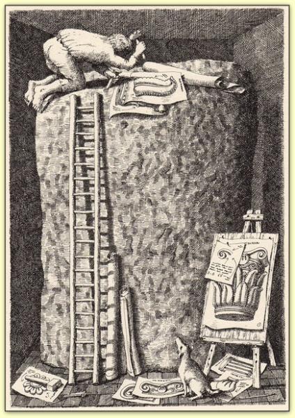Illustration de "Alberic le Sage" par Domenico Gnoli L'image qu'il a vu si clairement dans son esprit semblait toujours être hors de vue, un peu plus profonde dans la pierre. ("Alberic the Wise and Other Journeys" auteur Norton Juster - Pantheon Books, New York - 1965)