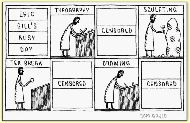 Dessin illustrant un journée du sculpteur Eric Gill Tom Gauld commente à travers ce dessin l'opinion des censeurs sur l'œuvre de Gill qui fut un personnage très controversé (jugé pour son goût pour l'art érotique et ses pratiques sexuelles déviantes...)