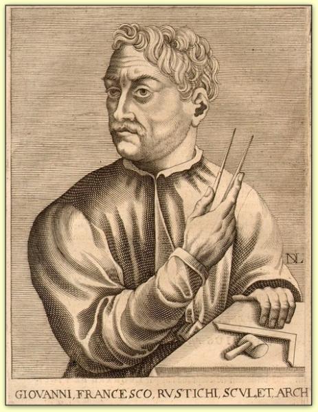 Giovanni Francesco Rustici ou Giovanfrancesco Rustichi Sculpteur et architecte italien, de Florence (1475/1554) Formé dans l'entourage de Verrocchio et a été l'ami de Léonard de Vinci. Il vint travailler en France pour François Ier en 1528 et il y demeura jusqu'à sa mort en 1554.