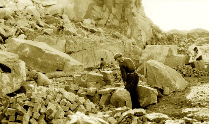Les hommes travaillent dur et toute la semaine, dix heures par jour et même dans certains cas jusqu'à 15 heures. Le dimanche, il faut préparer le travail pour la semaine à venir, c'est à dire affûter les outils, nettoyer les chantiers, entretenir les machines et pour certains faire encore et encore des pavés...