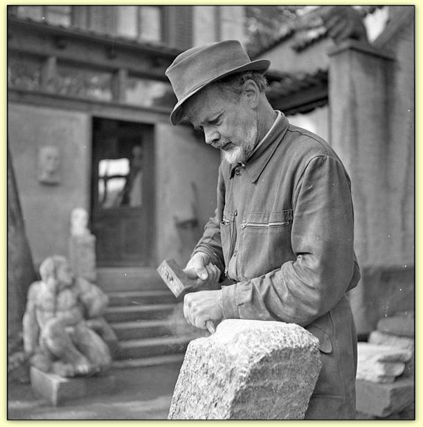 Gustave Steiz sculptant le buste en granit de Heinrich Mann (1953) Tailleur de pierre, dessinateur et sculpteur allemand (1906/1969) de style contemporain. Admirateur de Maillol et Despia, son œuvre et son style s'inspire de l'art étrusque ou encore des formes simplifiées et vigoureuses de l'art égyptien. |  |