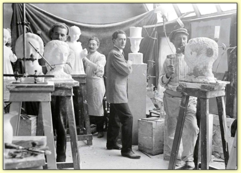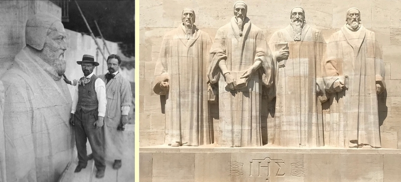 Les sculpteurs Henri Bouchard et Paul Landowski Henri Bouchard (1875-1960) au premier plan et Paul Landowski (1875-1961) au deuxième plan, finalisent en 1914 la sculpture du groupe central du mur des Réformateurs à Genève.