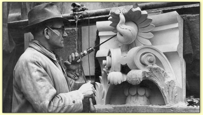 Sculpteur à la Cathédrale Saint Paul de Londres (UK) Un sculpteur utilise un foret à archet pour refouiller les détails d'un élément sculpté (1947)