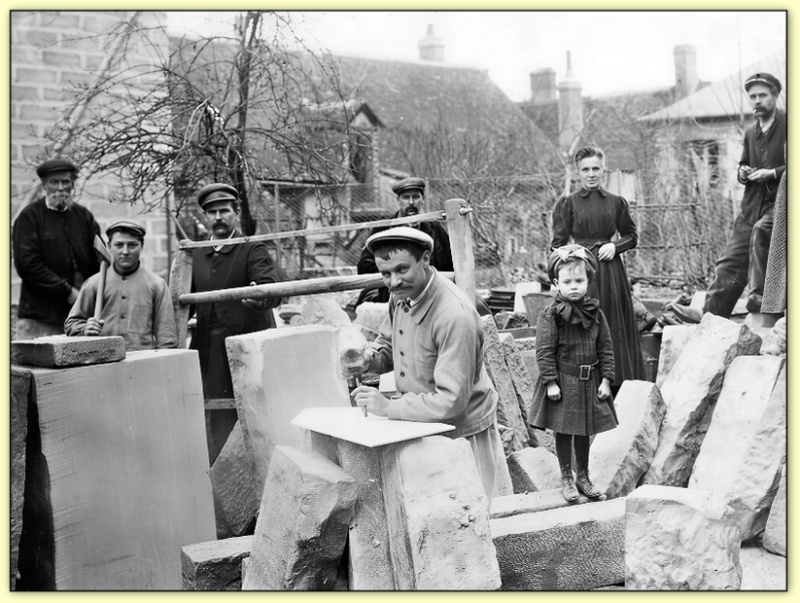 Tailleur de pierre au travail assis sur sa sielle Carrière d'Antoing (Belgique) |  |