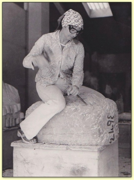 Corinne Franzén-Heslenfeld Corinne Franzén-Heslenfeld (1903/1989) est une sculptrice des Pays-Bas dont l'œuvre fut récompensée par le Prix de Rome en 1929. On la voit ici sculptant le futur monument de la Résistance d'Utrecht au Pays-Bas (1949) |  |