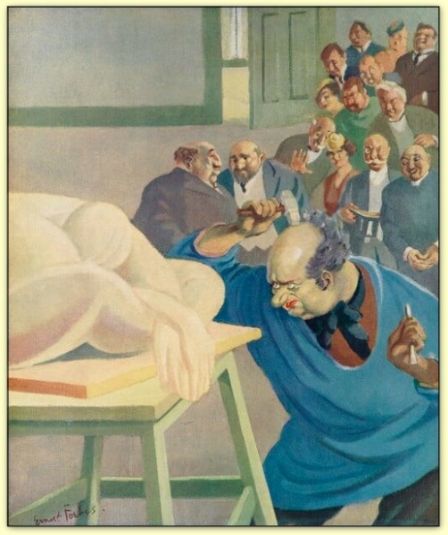 Jacob Epstein « La confrontation : le sculpteur Jacob Epstein prépare un nouveau problème pour son public » Caricature par Ernest Forbes (1937) Le sculpteur Jacob Epstein (1880 - 1959) est un sculpteur américain, pionnier de la sculpture moderne. Ses œuvres non conventionnelles provoquent la polémique en raison de la nudité des sujets ou de leur figuration. Ainsi, la société prude de son époque s'offusque de voir représentées les parties génitales de l'ange sur la tombe de d'Oscar Wilde (cimetière du Père-Lachaise à Paris) On lui doit la fameuse sculpture métallique "The Rock Drill" figurant sur la pochette du dernier album du groupe rock The Sensational Alex Harvey Band.