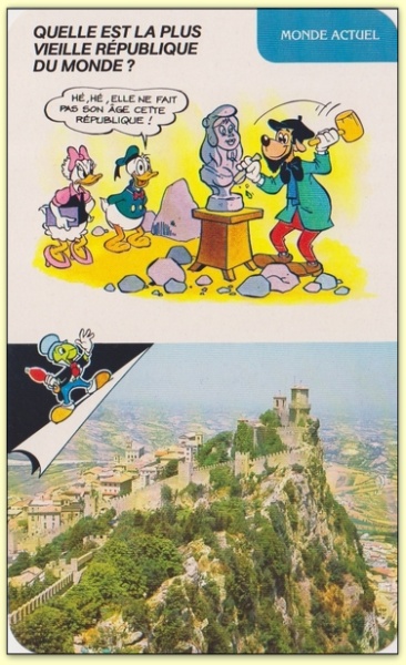 Plus vieille république du monde ? Donald et Minnie questionnent un sculpteur La réponse est Saint Marin, micro-État européen enclavé à l'intérieur de l'Italie et fondé par le modeste tailleur de pierre nommé Marinus. Fiche illustrée documentée Monde actuel |  |