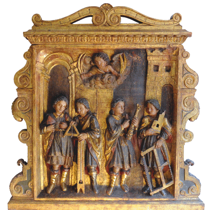 L'histoire des " Quatre Saints Couronnés " demeure mystérieuse, les sources étant contradictoires. Le seul élément certain est que ces Saints sont des Martyrs qu'on a honoré dans le passé, sans connaître leurs véritables noms (c'est pourquoi on les appelle simplement "couronnés" - de la couronne du martyre). On sait aussi qu'ils sont sculpteurs et qu'ils ont subi le martyre pour avoir refusé de sculpter des idoles.