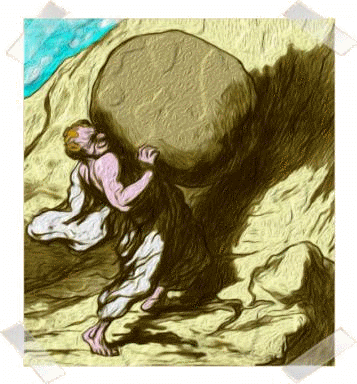 Il est aussitôt mis à l'ouvrage. Mais le problème c'est que chaque fois que Sisyphe arrive au sommet, ce maudit rocher retombe de l'autre côté de la colline (forcément !... Il n'y voit que couic...)