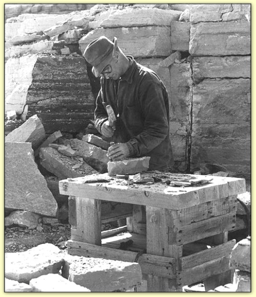 Tailleur de pierre au travail assis sur sa sielle Carrière d'Antoing (Belgique) |  |