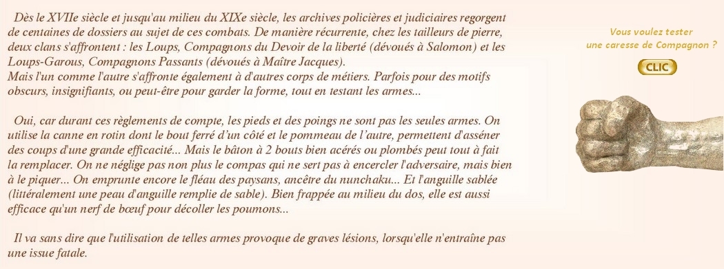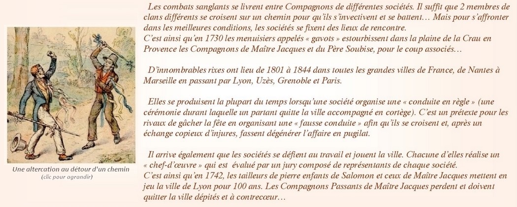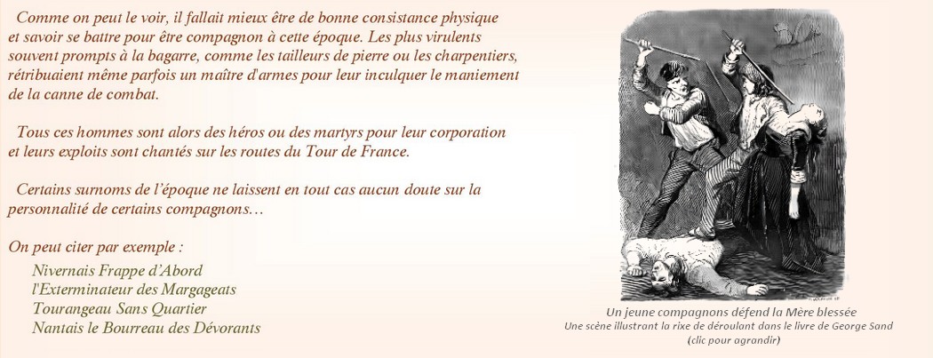 Et pourtant, la castagne, les coups de boule, Les châtaignes et autres joyeuseries parfois fatales, ont marqué toutes les époques. Même celle du compagnonnage qui, il fut un temps, a bien mal porté son nom !…