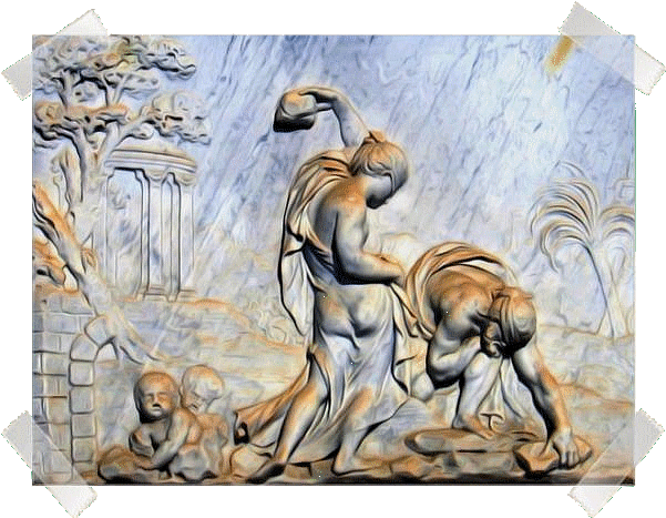 Quand Deucalion et Pyrrha virent qu'ils étaient les seuls survivants, ils remplirent une grille de Loto tout en se disant qu'il allait bien falloir qu'ils apprennent " Comment c'est qu'on fait les bébés " pour repeupler la terre... Ils décidèrent donc d'aller demander conseil à Thémis, la déesse de la justice.