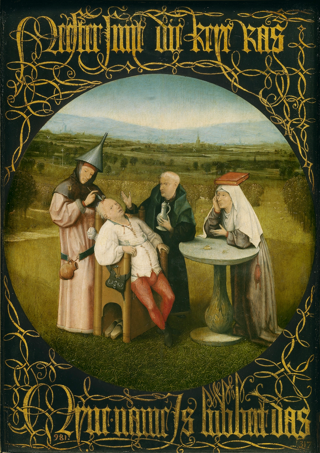 Au centre de la composition, le chirurgien principal, imperturbable et tout de noir vêtu, enlève la pierre du crâne d'un malade à l'aide de tenailles. A ses pieds sont éparpillés ses instruments de supplice, pinces, lancettes et crochets de fer...