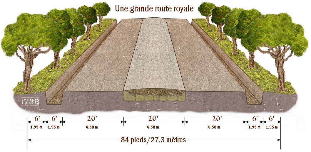 La largeur des routes est toujours prise entre deux fossés de 6 pieds (1,95 m). Les Grandes Routes sont arborées et comportent trois voies de 20 pieds chacune. Une chaussée pavée ou empierrée au milieu et deux bermes (chemins de terre) de part et d'autre.