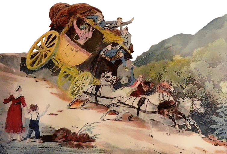 Bien évidement, les liaisons entre les villes et villages prennent un temps infini et les accidents sont fréquents. Il arrive que des voyageurs soient gravement blessés ou même tués durant leurs pérégrinations. Il y a aussi les pattes brisées des chevaux, les essieux des carrosses cassés ou leurs roues arrachées... Les déplacements sont rendus interminables, incertains et périlleux.