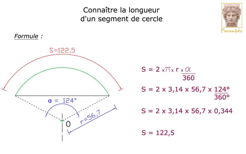 S = 2 x π x r x α ou bien : deux fois 3.14, fois le rayon, fois l'angle en degré divisé par 360 degré. 360