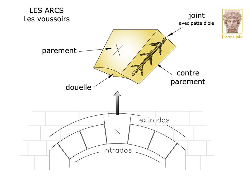 COOKIESCODE Les éléments appareillés qui constituent les arcs sont les voussoirs. les parties intérieurs et extérieurs d'un voussoir. s'appellent les douelles. L'ensemble des douelles intérieures constitue l'intrados de l'arc et l'ensemble de l'extérieur de l'arc, l'extrados.
