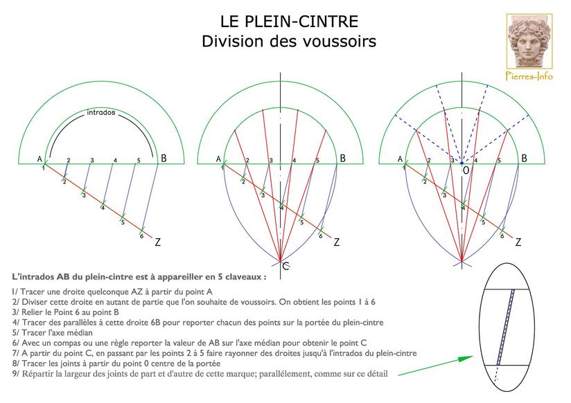 Voici une méthode de tracé traditionnelle pour la division et le tracé des voussoirs d'un plein-cintre. Elle peut être réalisée avec de simples compas, règle et équerre.