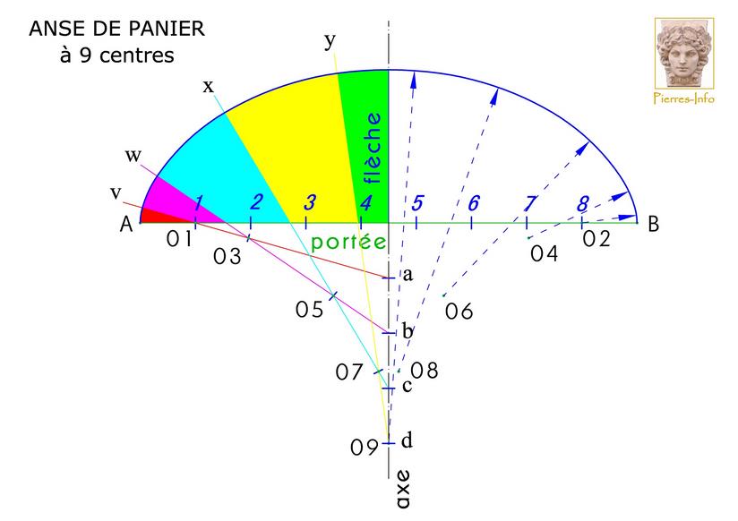 COOKIESCODE Comme son nom l'indique, l'anse de panier à 9 centres est formé de 9 arcs de cercle. Les anses de panier à 5, 7, 9 et 11 centres se tracent selon le même principe. Voici la façon de tracer celui à 9 centres :