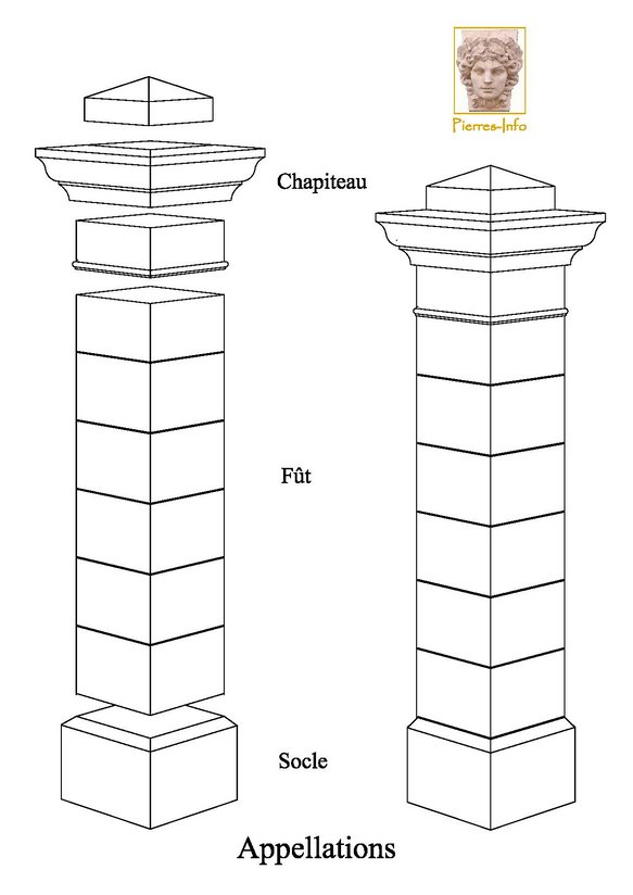 Le chapiteau est l'élément décoratif du pilier. Il peut être composé de plusieurs assises moulurées ou non et doit comporter un larmier en sous face.