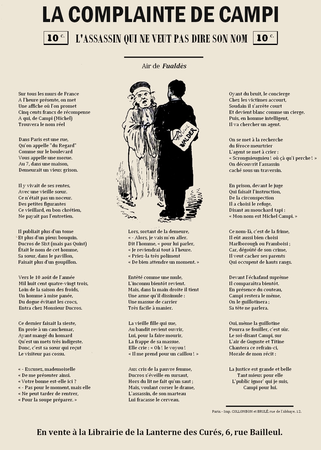 Encore à cette époque, les crimes font l'objet de complaintes. Vendues dans la rue par des "camelots", la complainte est rédigée sur une feuille volante appelée "canard sanglant". On y relate le crime en l'illustrant d'une scène représentative de l'affaire.