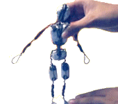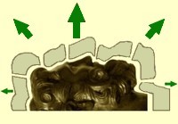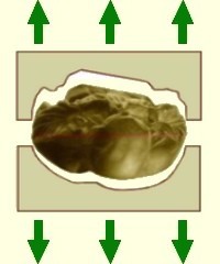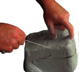 - Pour que la membrane en silicone se cale bien dans la chape en plâtre, il faut couper l'élastomère à la moitié de la largeur de la portée en terre. Des clés sont marquées dans la terre et des chutes d'élastomère durci (ou autre) sont découpées en forme de petits parallélépipèdes et disposées autour du moule en silicone. Ces plots sont recouverts avec un peu d'élastomère pour assurer une bonne liaison avec la membrane.