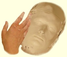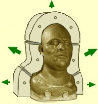 - Démoulage : Retourner l'ensemble du moule sur une surface plane. Le moule ne sert que pour une seule épreuve, il est donc détruit. Commencer par retirer le plâtre de surface et les bandes plâtrées, puis, plus délicatement l'alginate.