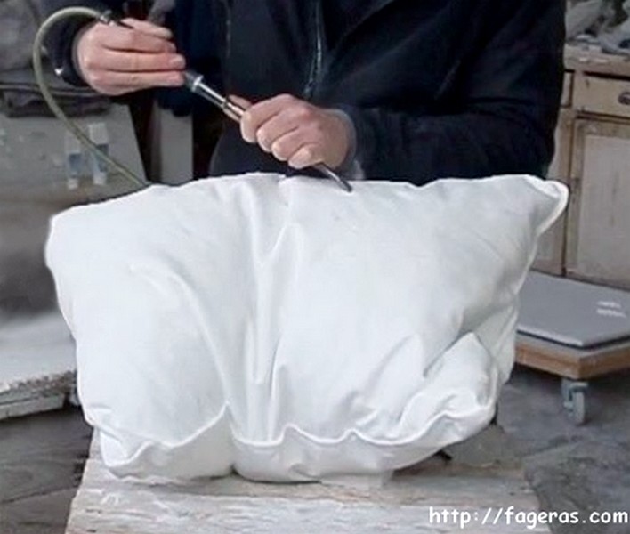 Sans même prendre la peine de faire un croquis, Filibert va chercher sa pierre et se met à l'ouvrage. Il a choisi une belle pierre blanche du Poitou, tendre et d'un blanc éclatant, le Migné. Quelques passes de scie diamantée pour mettre le caillou à dimensions, et puis, outils en mains, Filibert s'attaque à la forme. Enfermé dans sa bulle, il chasse, taille et cisèle sa pierre. Il pousse le détail jusqu'à sculpter la bordure ourlée de l'oreiller et le renfoncement que laisse la tête du dormeur.