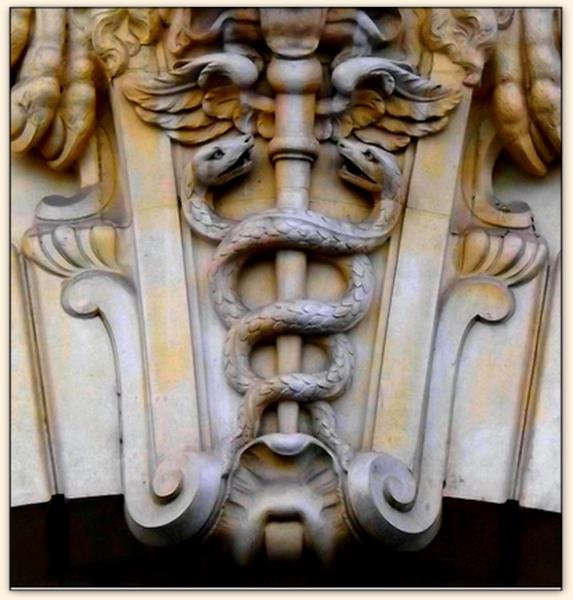 Le caducée est un symbole d'équilibre par l'intégration de forces contraires. L'énergie est pure. C'est une arme contre la banalité, le règne spirituel sur la vie terrestre, le règne de l'esprit sur le corps et sur les serpents qui sont figurés entourant le bâton.
