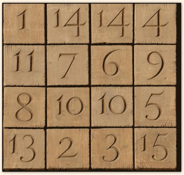 Sur la façade de la Sagrada Familía de Barcelone (notre image), on peut voir le cryptogramme de Subirach (du nom de son créateur, un sculpteur et peintre espagnol). Il s'agit d'un carré "magique" dont la somme de toute ligne, de toute colonne et des deux diagonales est égale à 33, l'âge de Jésus-Christ à sa mort. |